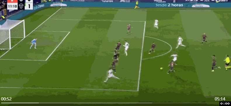 之后两队一顿闷战,直到尾声阶段再迎来高潮,第82分钟,埃尔切左路快速反击,瓦莱拉突到禁区边上兜传禁区中路,曼特孔点球点右侧抢点头球摆渡做球,博亚尔抢到第2落点凌空倒挂金钩,皮球应声入网,埃尔切2:2扳平比分。然而埃尔切并未能抢到1分,补时最后1分钟,莱万特右侧角球机会,奥拉萨加斯蒂操刀主罚兜传门前,马图罗人群中高高跃起抢点强力头槌攻门,皮球直入网窝,莱万特3:2压哨绝杀埃尔切。